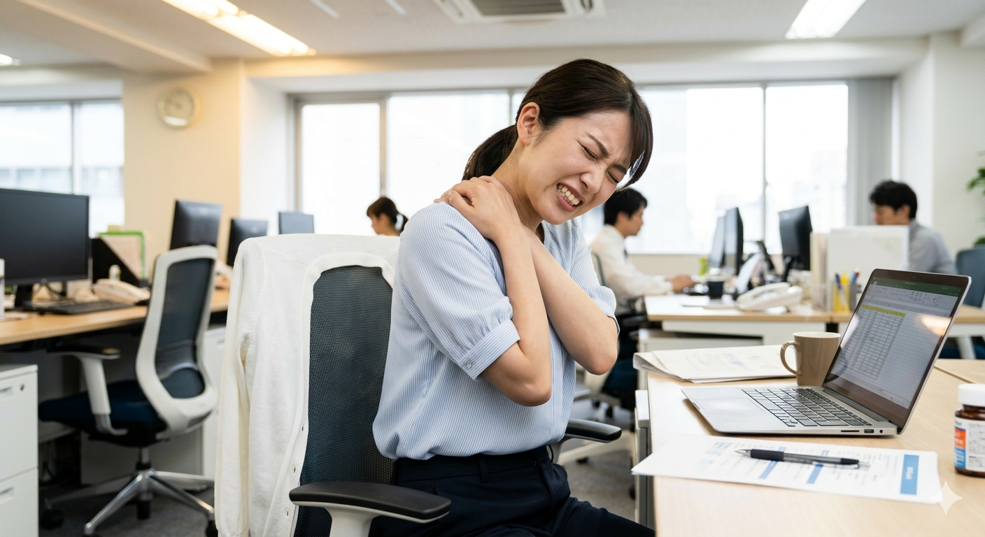 1. PC作業や物流業務など、長時間同じ姿勢を続けることで、肩周りの筋肉(僧帽筋や肩甲挙筋)が持続的に緊張します。